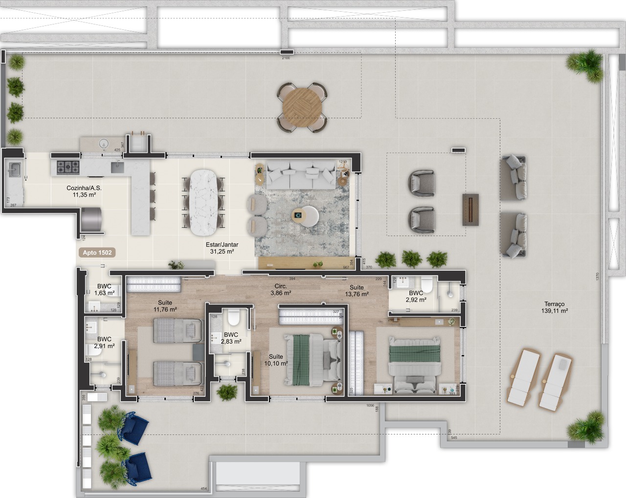 - Coberturas com 3 suítes, lavabo e terraço