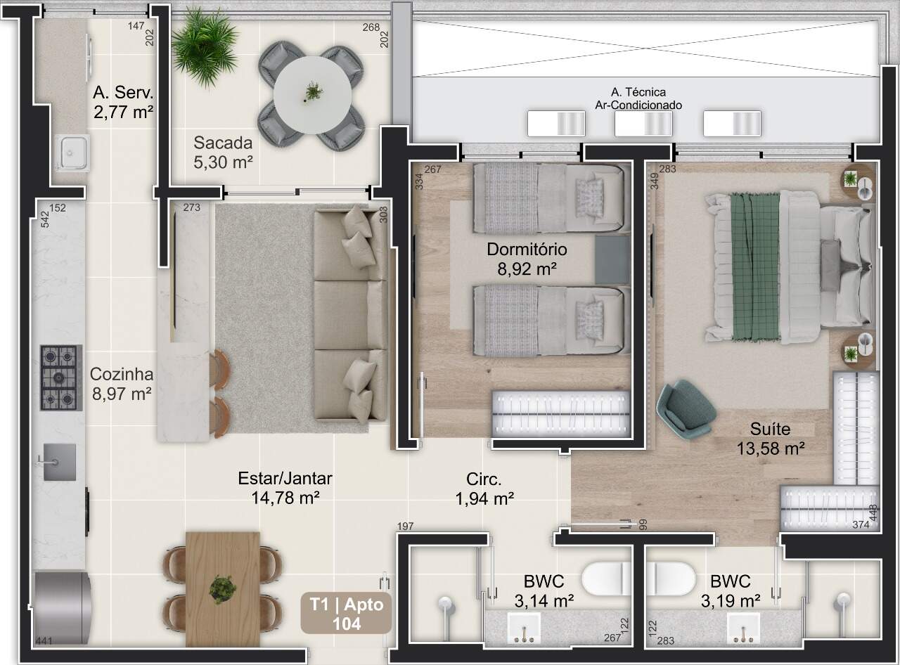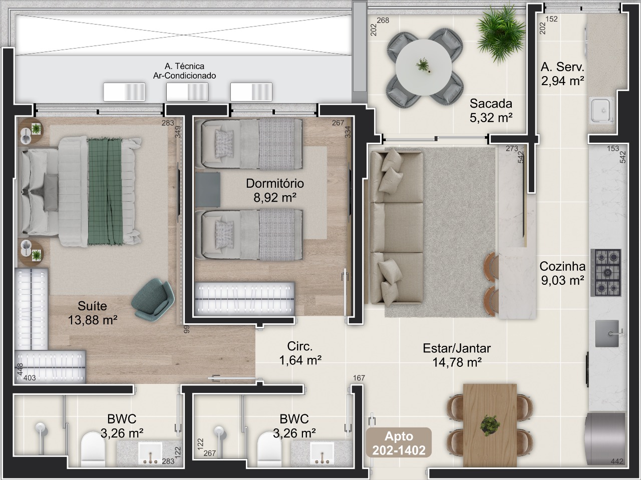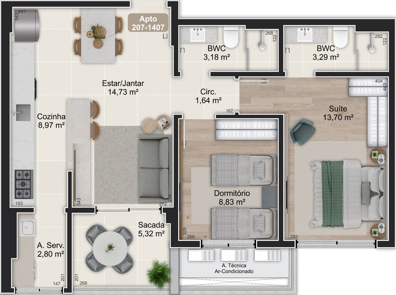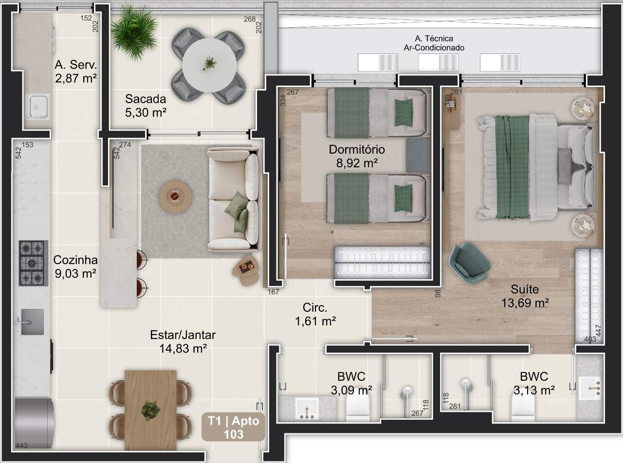 - Áreas privativas de 47,98m² a 136,09m²