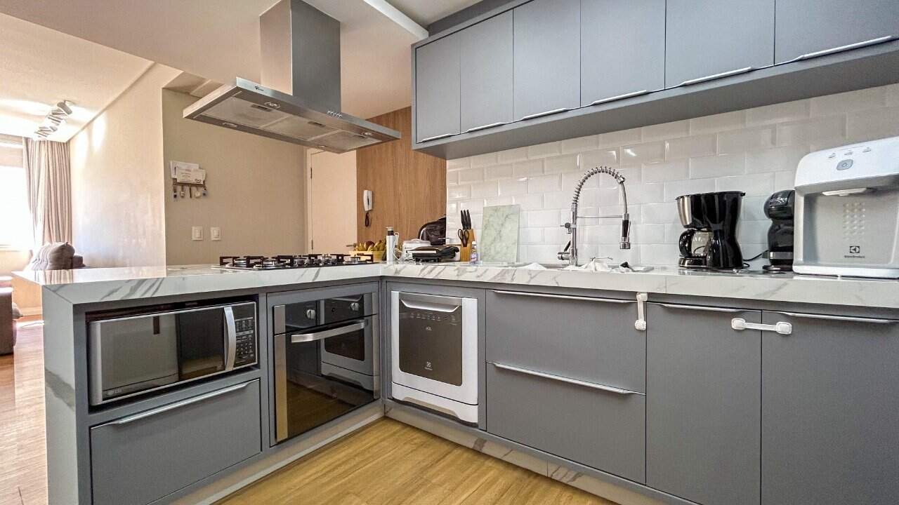 - Outras informações: Face principal leste. Ventilação cruzada. Piso vinílico e porcelanato. Apartamento mobiliado com móveis e eletros. Ar condicionado split instalado na sala e suíte. Suíte com closet. Hidrômetro individual. Vaga de garagem com manobra, tranca outro veiculo.